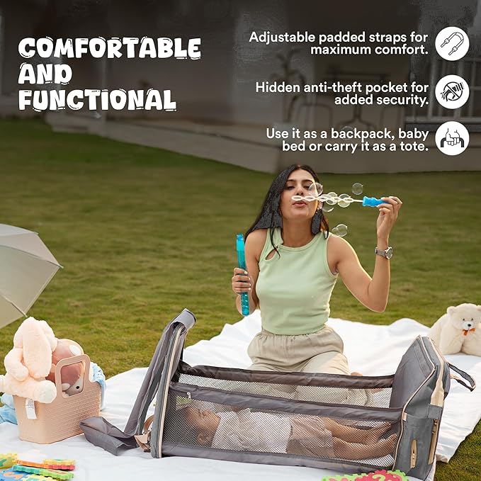- 3-IN-1 DIAPER BAG WITH FOLDABLE BABY BED AND CHANGING STATION: This multi-functional diaper backpack easily transforms into a foldable baby bed providing a comfortable and safe space for your baby to rest or for diaper changes. The foldable rods keep the bed stable and can be easily packed away when not in use